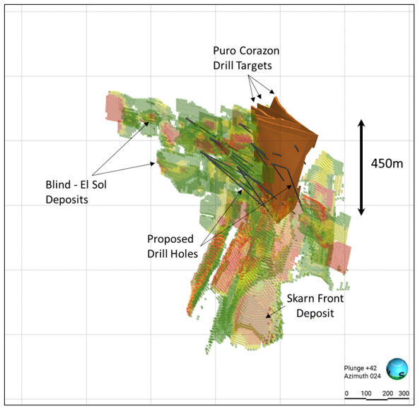Figure 2: Projected Puro Corazon drill targets within the Skarn Front and Blind-El Sol block models with proposed the drill pattern for Q4 drilling on the Puro Corazon claim