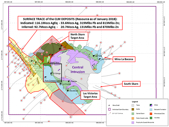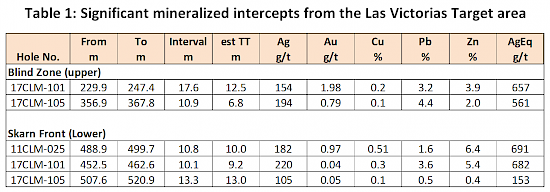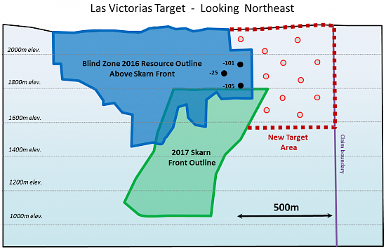 Mineralization in the Las Victorias zone is open for approximately 500 metres along strike to the southeast of drill holes 17CLM-101 and -105. Two separate mineralized zones are identified in these holes which are believed to be the lateral extensions of the Blind and Skarn Front zones respectively. As presently modelled, mineralization in Las Victorias zone is open laterally to the southeast and to depths of up to 500 metres.