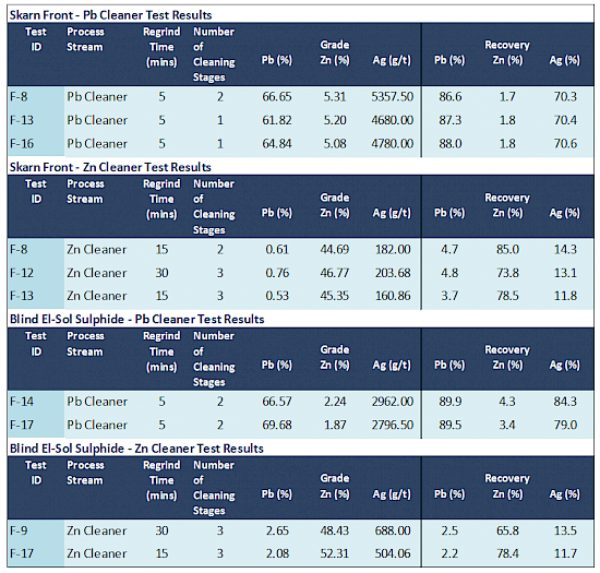 Three stages of cleaning were required to increase overall zinc performance in the test work with the best results from the Skarn Front material returning recoveries of 74% Zn to 85% Zn and grading from 44% to 46.7% Zn. Minimal lead cleaning was required to produce high concentrate grades of over 60% Pb in the lead concentrate. Silver which partitions into the lead concentrate returned grades of over 2500g/t Ag in the Blind El Sol and over 4500g/t Ag in the Skarn Front.