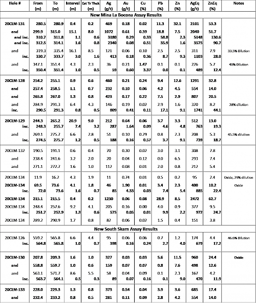 - 1.6m down-hole (1.0m est. TT) grading 327g/t AgEq, 5.6% Pb and 11.5% Zn (960g/t AgEq; 24.4% Zn) from drill hole 20CLM-130 in the South Skarn target.