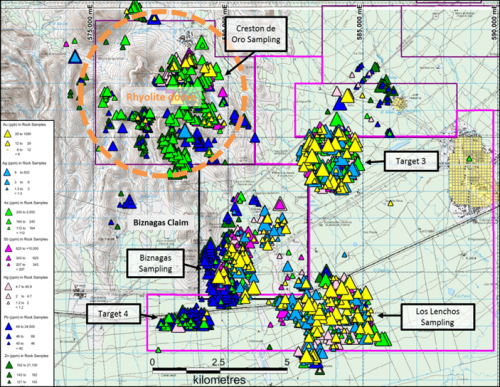 In 2017, a regional sampling program on the newly staked CLM West claims identified a large, 12km long precious metal enriched epithermal exploration target. A total of >2200 rock samples were taken which identified significant potential for a deposit buried under gravel cover.