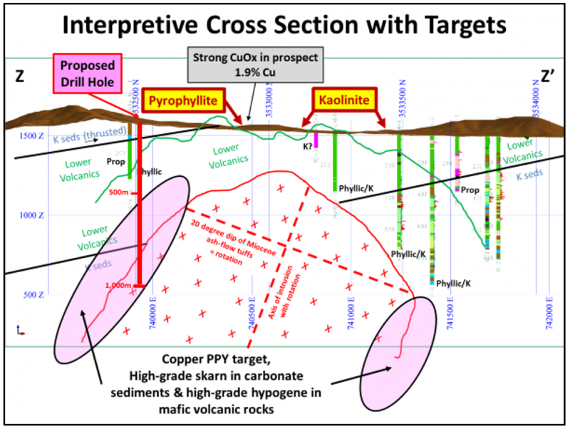 Targeting for copper mineralization (see Interpretive Cross Section) is based upon 3D modelling of data generated by geologic mapping, historic drill holes, geochemical zoning studies, alteration clay zoning studies, and airborne geophysical surveys. A 4-hole (4,050 metre) diamond drill program commenced in early-2022 and is now complete. Drilling to date has successfully identified: