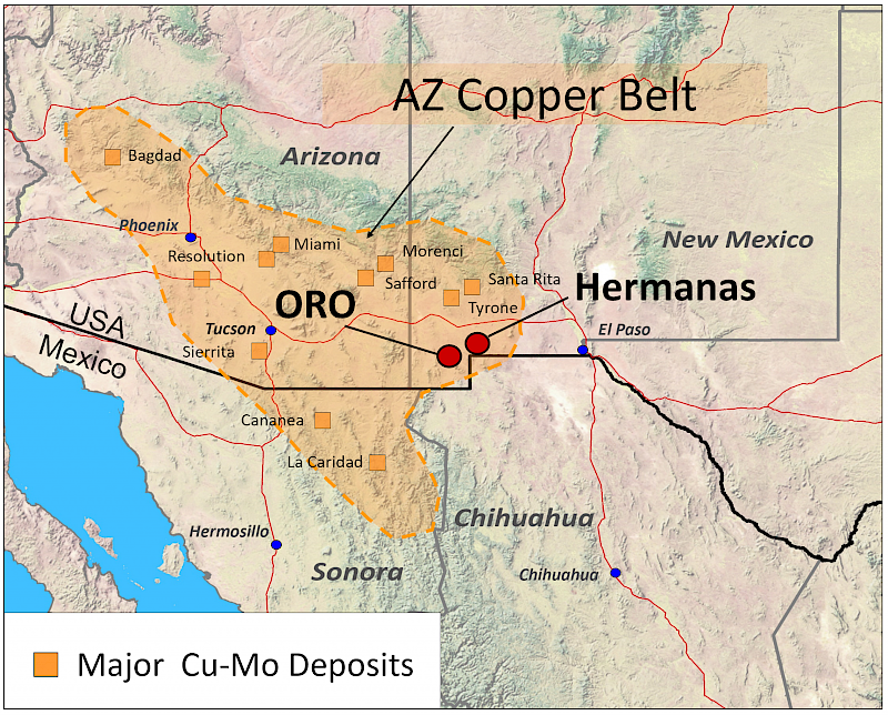Commenting on these recent results, President Lawrence Page K.C. said, “Oro is a large, well-zoned mineral system situated along a major regional trend containing world-class copper deposits and mines extending from southwestern New Mexico into eastern Arizona. Verification of classic copper porphyry metal zoning in these initial four core holes is very encouraging. Our interpretations from this most recent drilling and earlier work suggests that the entire hydrothermal system is preserved beneath a tilted clay-rich Lithocap leaving tremendous opportunities for the discovery of significant new Cu-Mo deposits both at depth and in related high-grade structures throughout the property.”